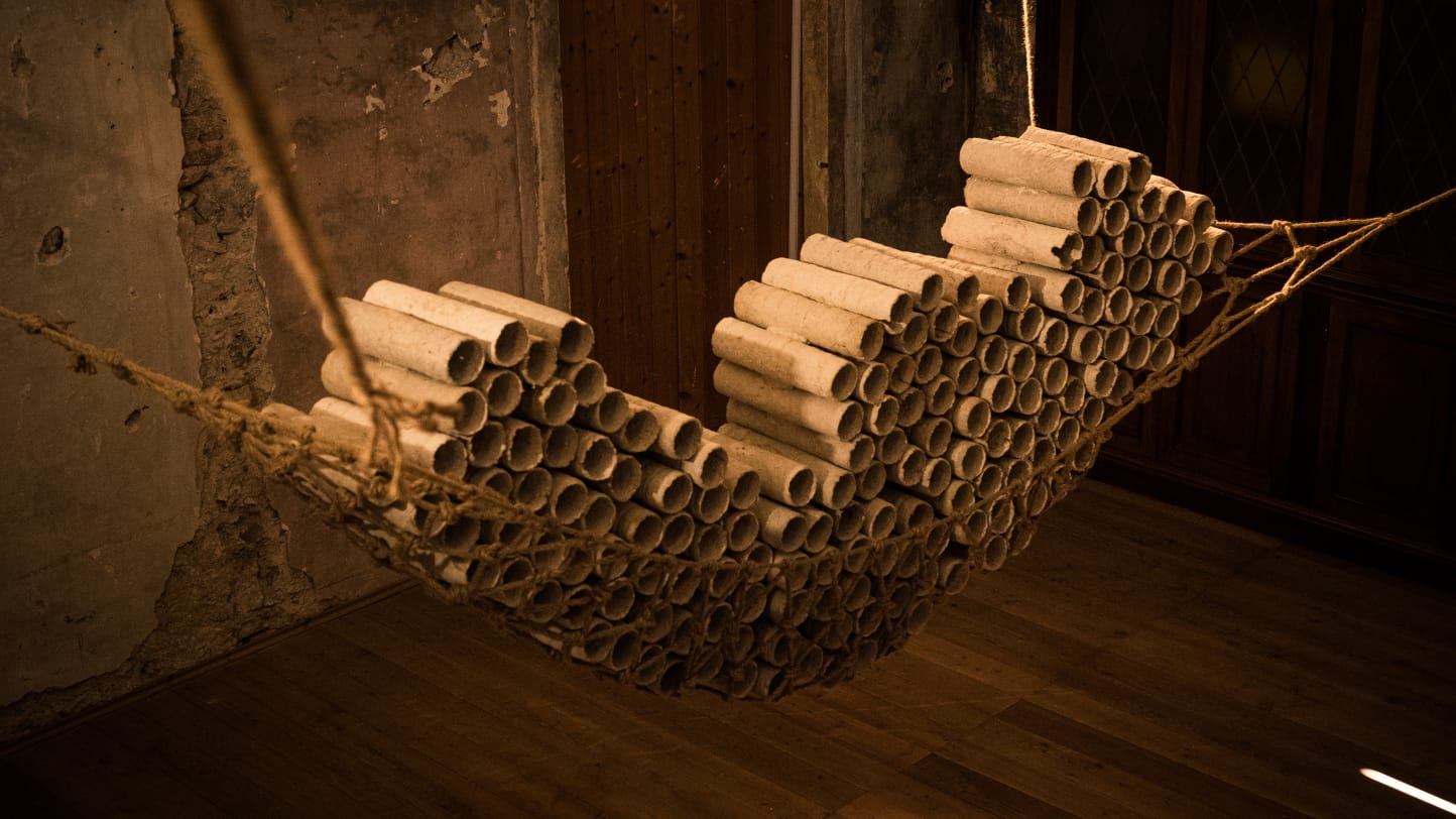 Appena sopra di noi un ammasso di oggetti si slarga entro il telo, che cede deformandosi come un vecchio indumento, una metamorfosi fisica, graduale e necessaria al contenere. Vuoti e pieni si adattano all’interno mantenendo il proprio volume, trovano un proprio posto.